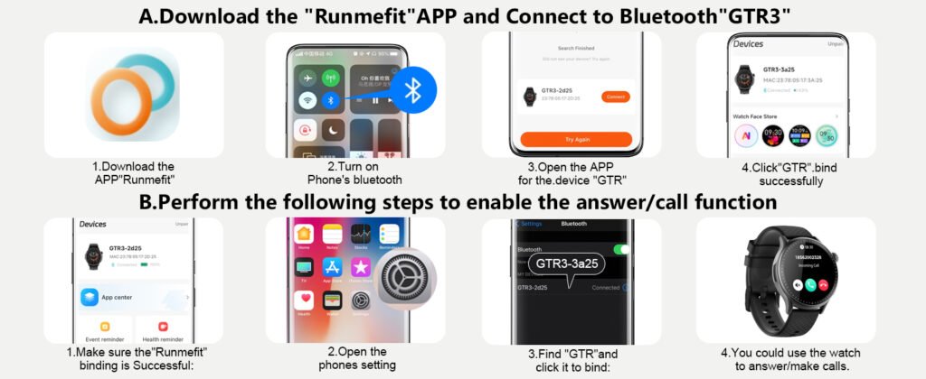 Open the Runmefit app and search for your device (for example, “GTR3”). Select it and complete the binding process inside the app.
